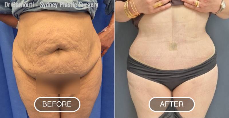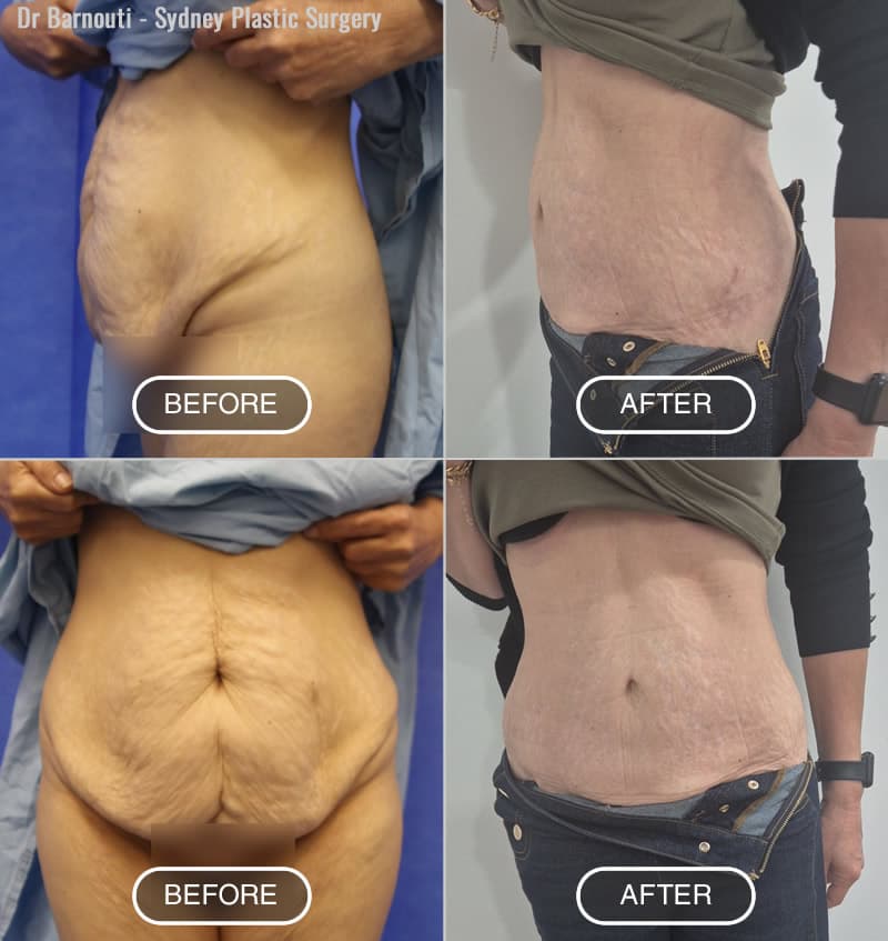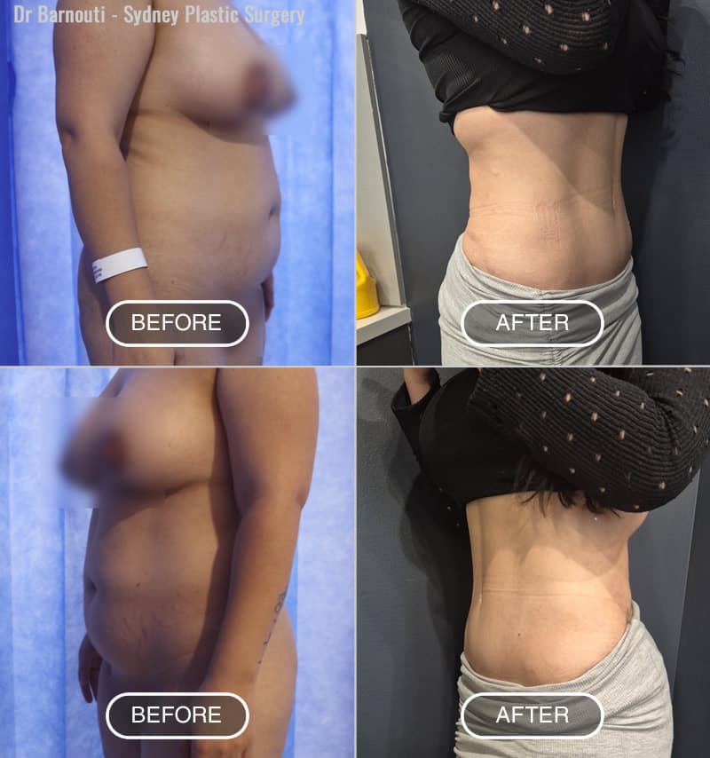 These images show individual outcomes following abdominoplasty procedures performed by Dr Barnouti. Each case is tailored to the patient’s anatomy and surgical goals.