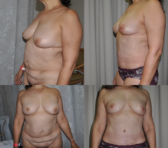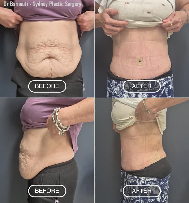 These images show individual outcomes following abdominoplasty procedures performed by Dr Barnouti. Each case is tailored to the patient’s anatomy and surgical goals.